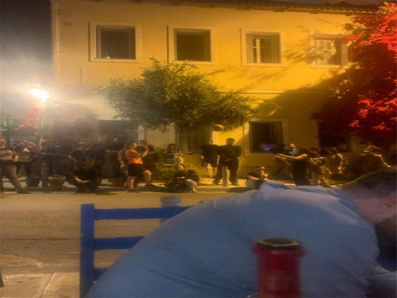 Από τις 21:30 περίπου όταν πληροφορήθηκαν ότι ο Κώστας Μπακογιάννης συντρώγει με δημοτικούς συμβούλους του, μεταξύ των οποίων ο Λευτέρης Σκιαδάς και ο Νίκος Αβραμίδης, έσπευσαν και συγκεντρώθηκαν στο απέναντι πεζοδρόμιο.