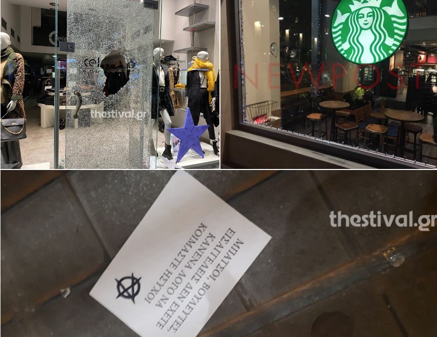 Προκάλεσαν φθορές στις προσόψεις εμπορικών καταστημάτων που βρίσκονται στις οδούς Τσιμισκή, Παύλου Μελά και Γρηγορίου Παλαμά, ενώ πέταξαν φέιγ-βολάν με μηνύματα κατά των Αστυνομικών, των βουλευτών και των λειτουργών της Δικαιοσύνης.