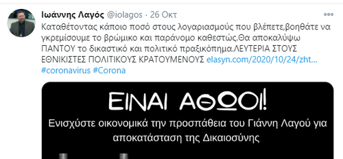 Αν αναμονή της άρσης της ασυλίας του Γ. Λαγού, ο ίδιος προκαλεί και μέσω ανάρτησής του τόσο στο Twitter όσο και στην ιστοσελίδα του κόμματος που ίδρυσε όταν ανεξαρτητοποιήθηκε από τη ΧΑ (ΕΛΑΣΥΝ) ζητά οικονομική ενίσχυση, δημοσιεύοντας και σχετικό τραπεζικό λογαριασμό, τονίζοντας: «Καταθέτοντας κάποιο ποσό στους λογαριασμούς που βλέπετε, βοηθάτε να γκρεμίσουμε το βρώμικο και παράνομο καθεστώς, Θα αποκαλύψω ΠΑΝΤΟΥ το δικαστικό και πολιτικό πραξικόπημα, Λευτεριά στους εθνικιστές πολιτικούς κρατούμενους».