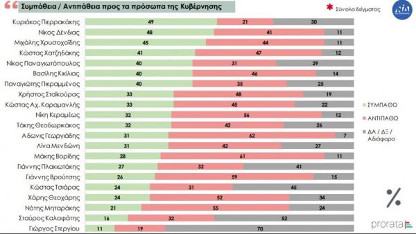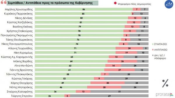 Στην ερώτηση σχετικά με τη συμπάθεια προς τα πολιτικά πρόσωπα, στη Κυβέρνηση της Νέας Δημοκρατίας πρώτος έρχεται στο σύνολο του δείγματος ο Κυριάκος Πιερρακάκης με 49%, ενώ στους ψηφοφόρους του κόμματος πρώτος έρχεται ο Μιχάλης Χρυσοχοϊδης με 86%.