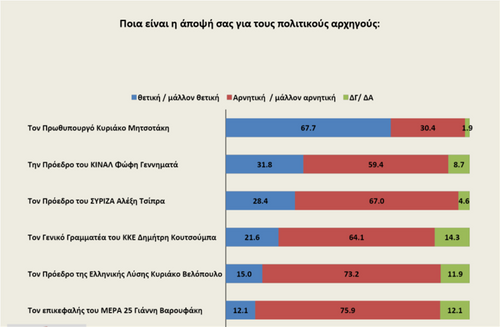 Ο Κυριάκος Μητσοτάκης κυριαρχεί απόλυτα στο πολιτικό σκηνικό αφού διαθέτει το 67.7% των θετικών απόψεων των πολιτών, ενώ το 70% τον κρίνει θετικά ως Πρωθυπουργό. Μάλιστα τα ποσοστά αυτά αυξάνονται. Δείχνει να διαθέτει ένα διακομματικό ακροατήριο που τον αντιμετωπίζει θετικά και βασικά με εμπιστοσύνη.