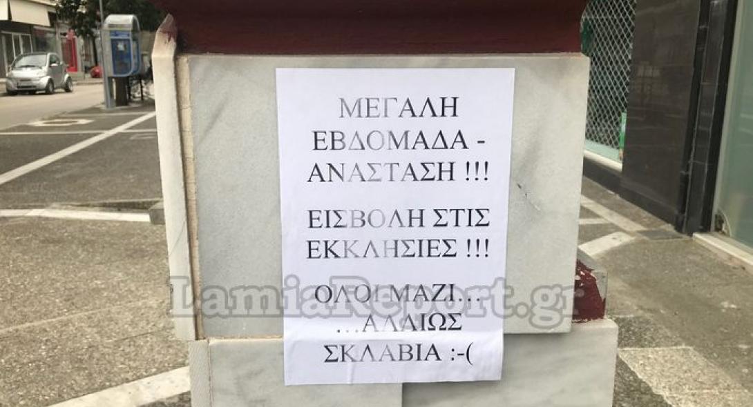 Άγνωστος χρησιμοποίησε εικόνισμα στη συμβολή των οδών Καζούλη και Υψηλάντη στο κέντρο της Λαμίας, στο οποίο και κόλλησε ένα χαρτί με το εξής μήνυμα: «ΜΕΓΑΛΗ ΕΒΔΟΜΑΔΑ ΑΝΑΣΤΑΣΗ!!! ΕΙΣΒΟΛΗ ΣΤΙΣ ΕΚΚΛΗΣΙΕΣ!!! ΟΛΟΙ ΜΑΖΙ… ΑΛΛΙΩΣ ΣΚΛΑΒΙΑ :-(».