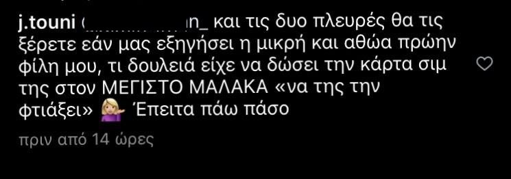 “Και τις δύο πλευρές θα τις ξέρετε εάν μας εξηγήσει η μικρή και αθώα πρώην φίλη μου, τι δουλειά είχε να δώσει την κάρτα σιμ της στον μέγιστο μ@λ@κα «να της την φτιάξει». Έπειτα πάω πάσο”, έγραψε χαρακτηριστικά η Ιωάννα Τούνη.