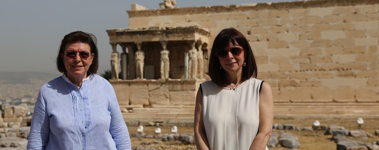Η Πρόεδρος της Δημοκρατίας έφτασε στις 10 το πρωί και ξεναγήθηκε από την Υπουργό Λίνα Μενδώνη στον ιερό Βράχο, ενώ της έγινε “ξενάγηση” και στα μέτρα ασφαλείας.