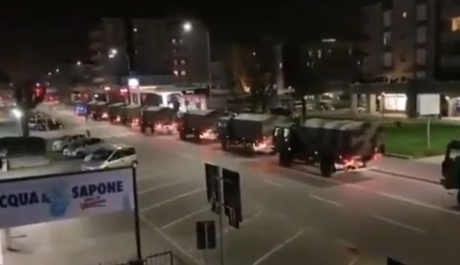 Σοκαριστική η εικόνα της πομπής φορτηγών του στρατού που μεταφέρουν εκτός Μπέργκαμο σορούς νεκρών από κορονοϊό, διότι το κρεματόριο δεν μπορεί να ανταποκριθεί στις ανάγκες αποτέφρωσης.