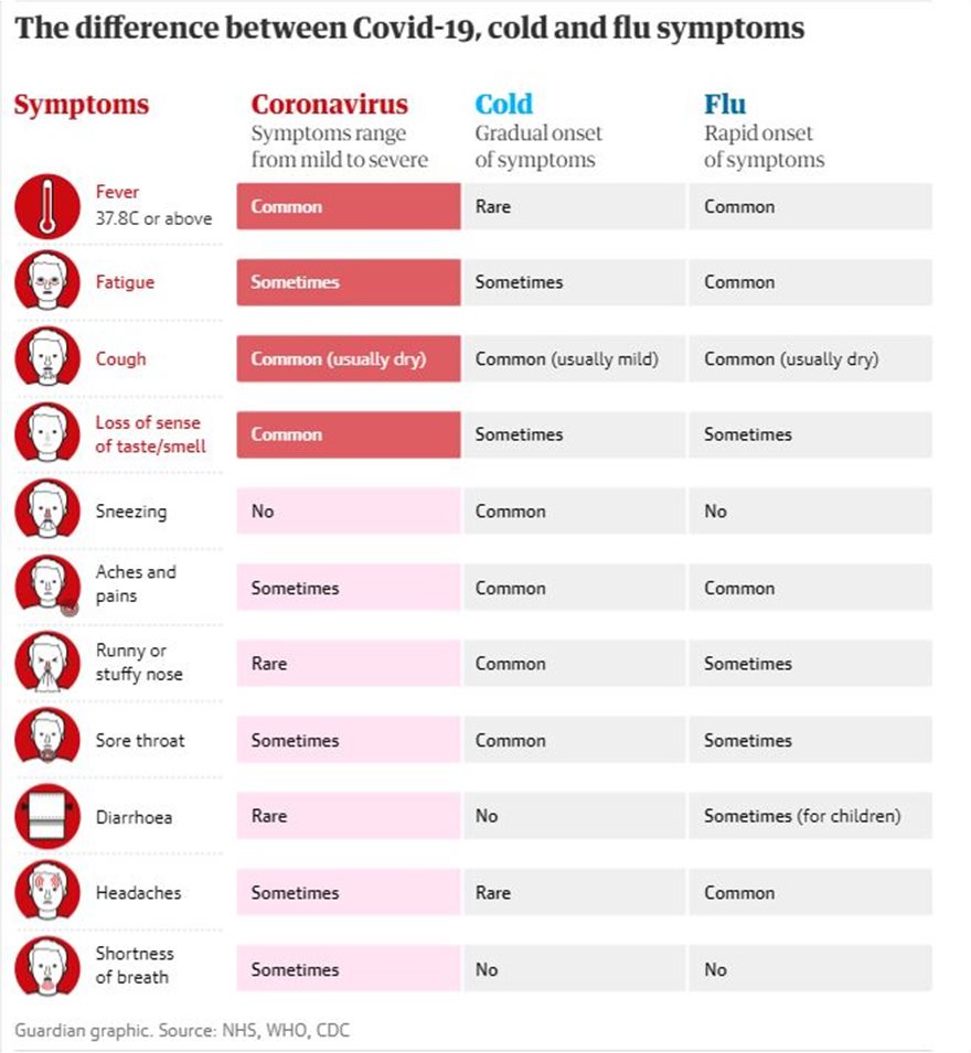 Η εφημερίδα Guardian συνόψισε τον «οδηγό συμπτωμάτων» σε έναν απλό και κατανοητό πίνακα: