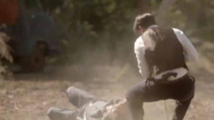 Ήταν μια σκηνή που γυρίστηκε τον Ιούλιο, κάτω από πολύ δύσκολες συνθήκες σε ένα φρεσκοοργωμένο χωράφι στο Μαρκόπουλο, με τον ήλιο να ζεματάει από πάνω. Αυτό το τράβηγμα, που ήταν δεμένος ο Κλεομένης και τον τράβαγε ο Μελέτης έγινε κανονικότατα τρεις φορές. Δεν έγινε κάποιο τρικ. Ήταν δεμένα τα χέρια, υποβοηθούσα κι εγώ. Όταν τελείωσε και με εκτέλεσε, μου έδωσε το χέρι του να βγω, κάναμε μια πολύ δυνατή αγκαλιά συγκινημένοι, σαν συνάδελφοι. Του χρωστάω πολλά του Γιώργου Γεροντιδάκη, να ναι καλά».