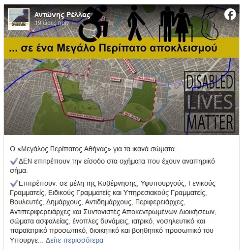 Tον αποκλεισμό των αναπήρων και των εμποδιζόμενων προσώπων με βάση τον σχεδιασμό του «Μεγάλου Περίπατου της Αθήνας καταγγέλλει με ανάρτησή του στο facebook ο ανάπηρος ακτιβιστής, Αντώνης Ρέλλας, καταγράφοντας παράλληλα όλες τις ελλείψεις προσβασιμότητας.