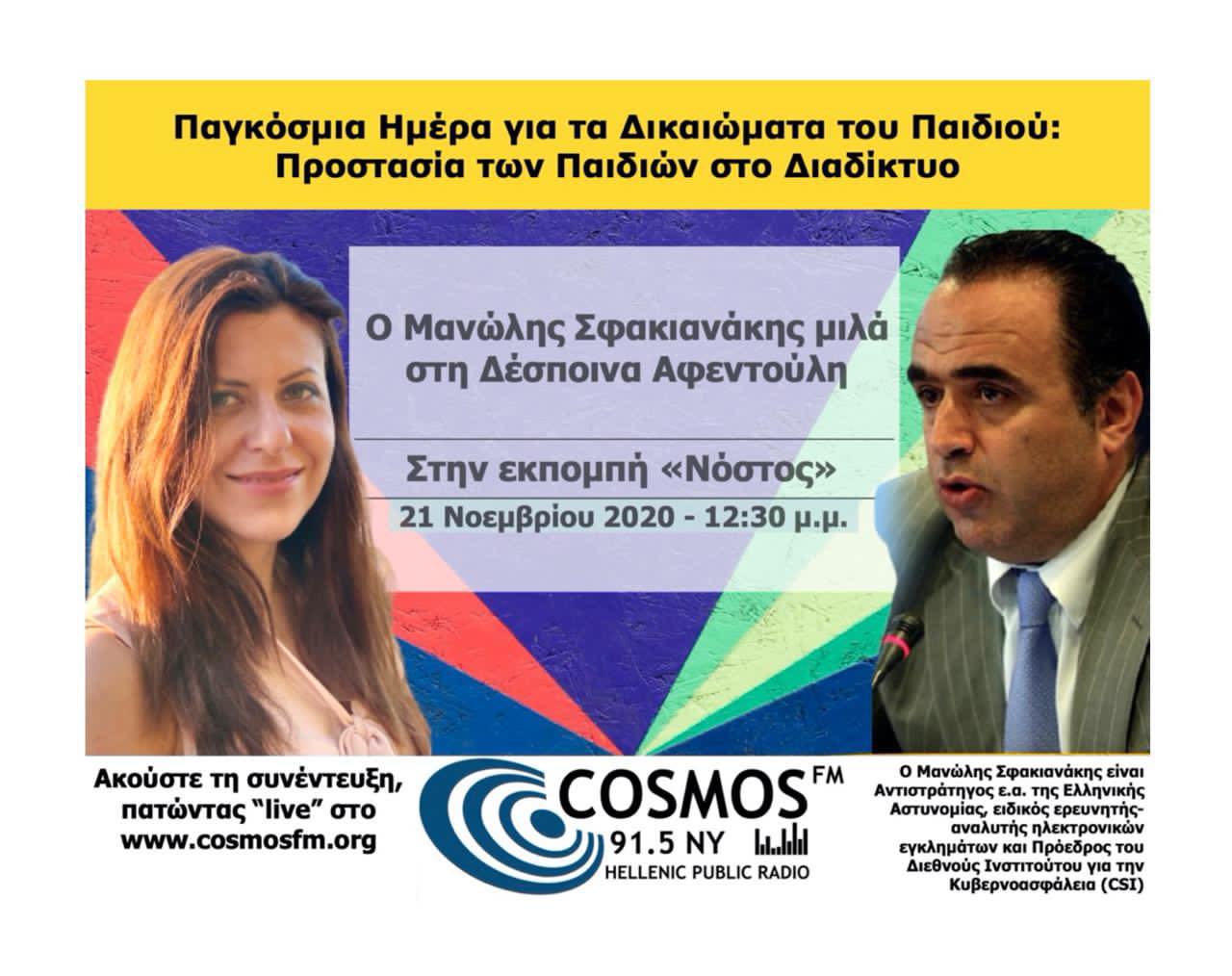Με αφορμή την παγκόσμια ημέρα των παιδίων για τα διακιωματα στις 21 νοεμβρίου ο πρόεδρος του ινστιτούτου CSI Μανώλης Σφακιανάκης θα μιλήσει στο cosmos Fm στις 12και μιση και θα δώσει συμβούλες για το πως οι γονείς θα μπορούν να προστατεύουν τα παιδία τους στο διαδίκτυο.