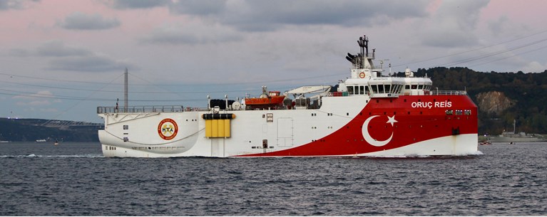 Δίπλα του είναι τα τουρκικά πολεμικά πλοία, ενώ σε απόσταση αναπνοής βρίσκονται οι φρεγάτες και πυραυλάκατοι του ελληνικού πολεμικού ναυτικού, με ιδιαίτερα ενισχυμένη παρουσία.