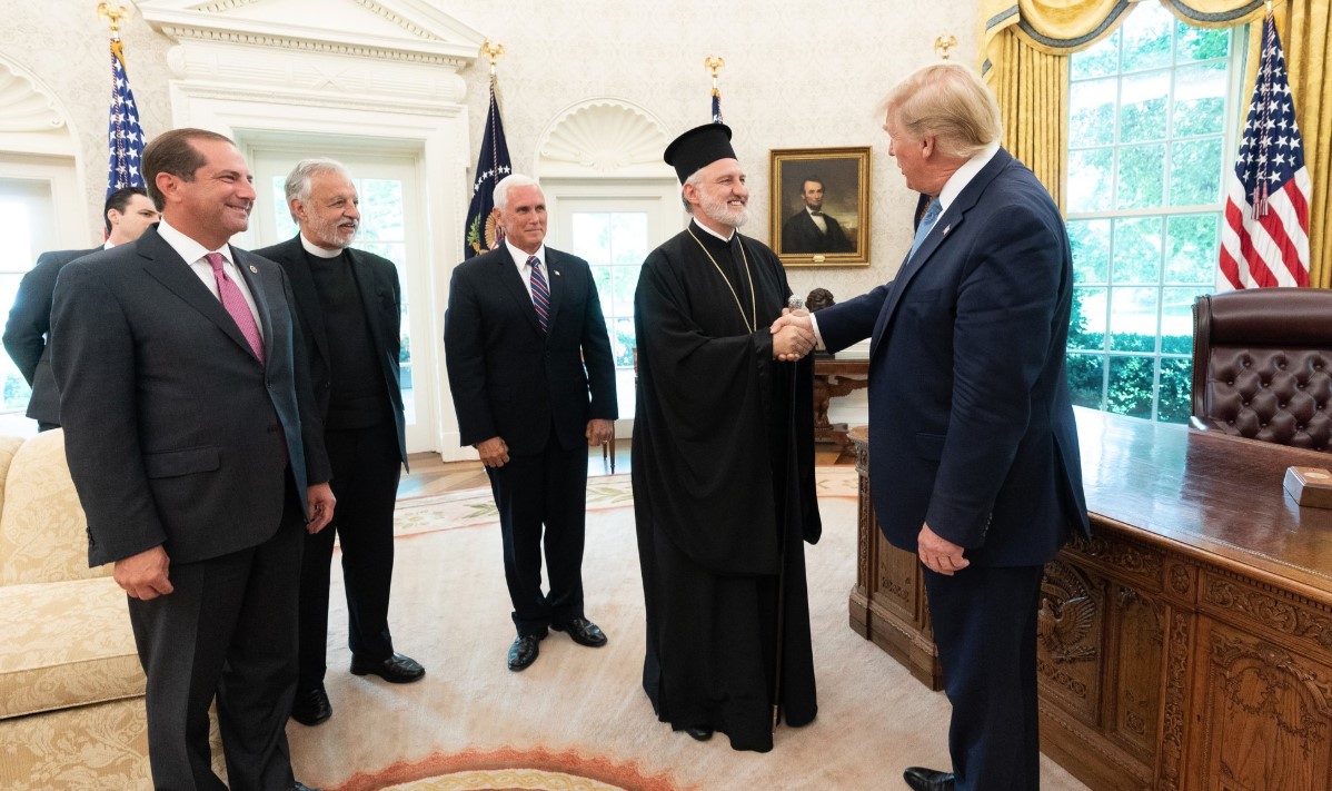 Εγκάρδια συνάντηση είχε ο Αρχιεπίσκοπος Αμερικής Ελπιδοφόρος με τον Πρόεδρο των Ηνωμένων Πολιτειών Ντόναλντ Τραμπ στο επίσημο Προεδρικό Γραφείο γνωστό ως Οβάλ Γραφείο.