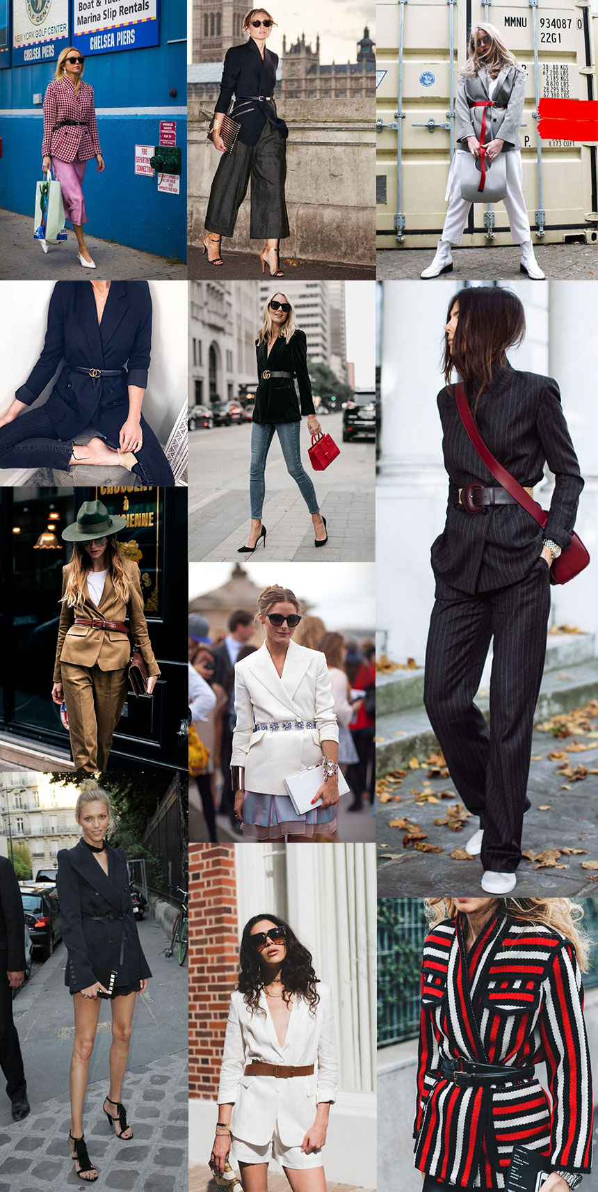 Η τάση που αγαπώ ιδιαιτέρως όμως είναι η ζώνη πάνω από το σακάκι. Με μια απλή κίνηση, ακόμα κι ένα κλασικό σύνολο, γίνεται πιο μοντέρνο και αποκτά ενδιαφέρον. Δοκίμασέ το! Kι ένα παλιό σακάκι που έχει ξεχαστεί κάπου στην ντουλάπα σου μπορεί να δείχνει καινούριο, προσθέτοντας απλά το σωστό αξεσουάρ.