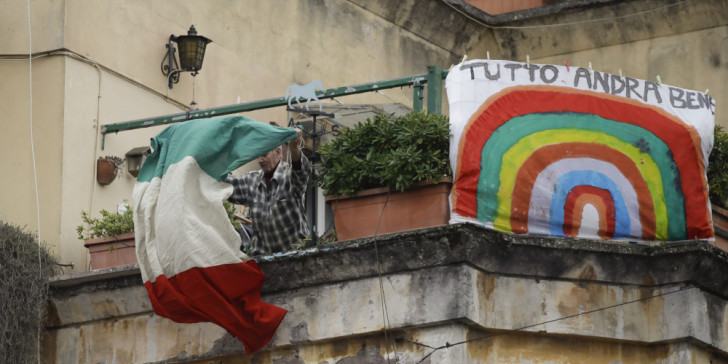 Στην Ιταλία, οι κάτοικοι κρεμούν ιταλικές σημαίες στα μπαλκόνια τους, θέλοντας να δώσουν κουράγιο ο ένας στον άλλο, καθώς η χώρα μετρά πάνω από 4.800 νεκρούς.